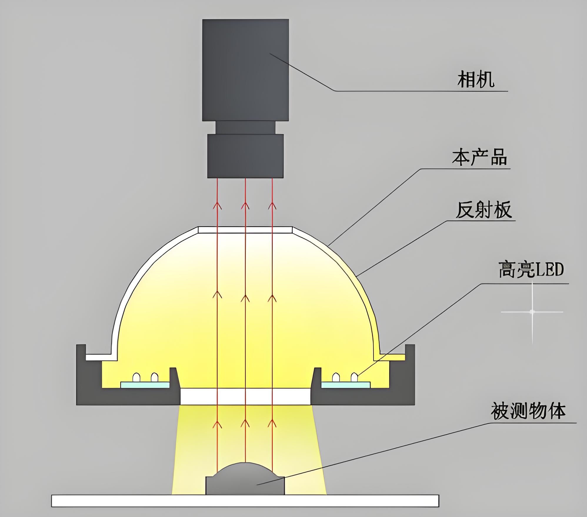 - LED燈(deng)帶(dai):安裝(zhuang)在穹頂(ding)的側壁或底(di)部邊緣,光線(xian)不直接(jie)射(she)向(xiang)被測物,而是(shi)射(she)向(xiang)穹頂(ding)內壁。